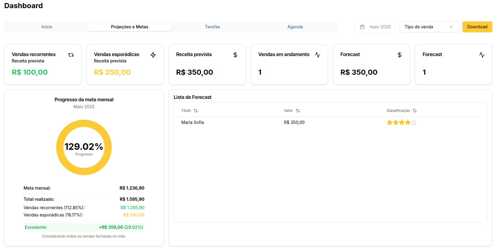 Indicadores de receita e andamento de vendas para o mês selecionado:- Vendas recorrentes (Receita prevista)