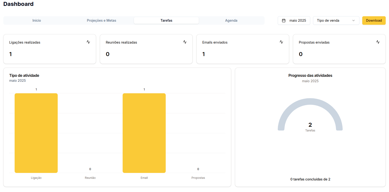 A aba Tarefas exibe as atividades realizadas no período selecionado.Indicadores principais